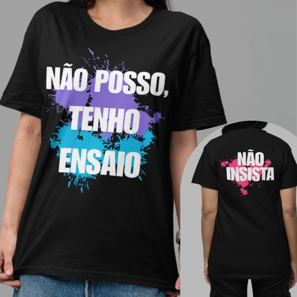 1 camiseta exclusiva feita em tecido leve, confortável e com caimento perfeito para ensaios, aulas e o dia a dia.