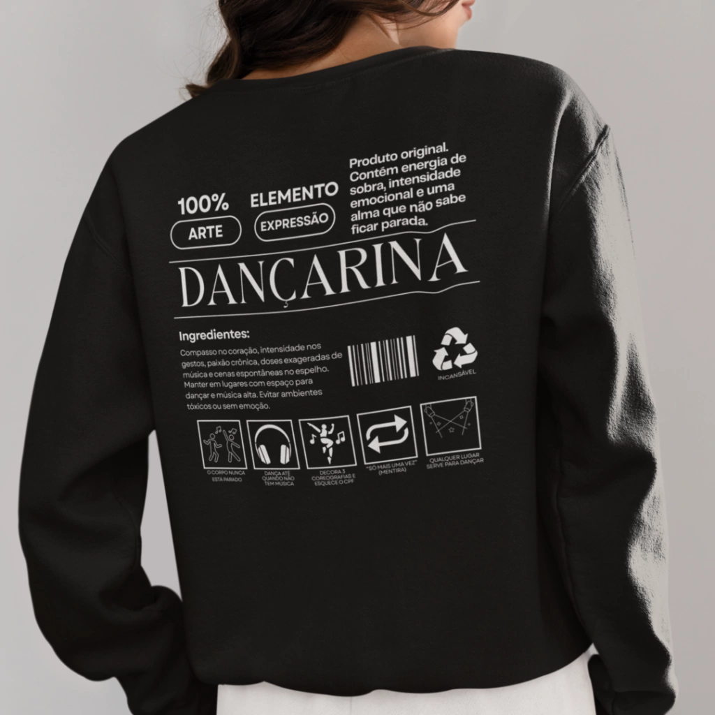 Feito para quem transforma emoção em movimento, esse moletom é mais do que uma peça de roupa — é identidade. Com uma estampa criativa e cheia de personalidade, inspirada nas embalagens de produto, ele traduz o que é ser dançarina: uma alma intensa, expressiva e que nunca fica parada.