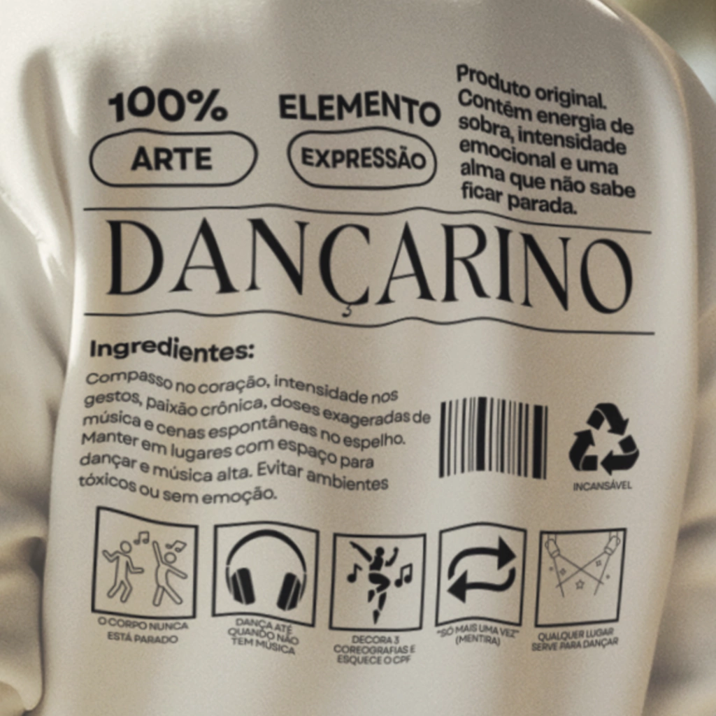 Criado para quem vive com o ritmo no peito e expressão nos movimentos, este moletom é mais do que uma peça de roupa — é um manifesto. A estampa tem estilo irreverente e criativo, inspirada nas etiquetas de produtos, e celebra tudo o que é sentir, viver e se mover através da arte da dança.